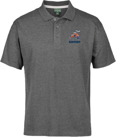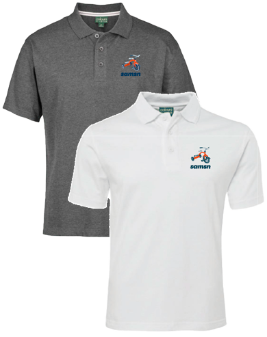 Polo-Trike & SAMSN Embroidery. 100% Cotton Jersey knit fabric 190cm. Raised edging detail on knitted collar. Easy care fabric, quick drying. Colour is available in White and Grey.